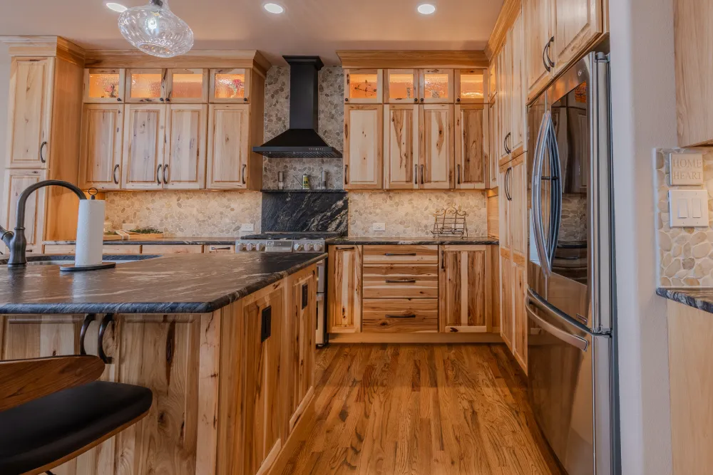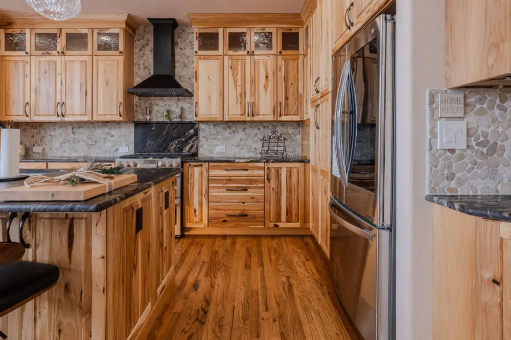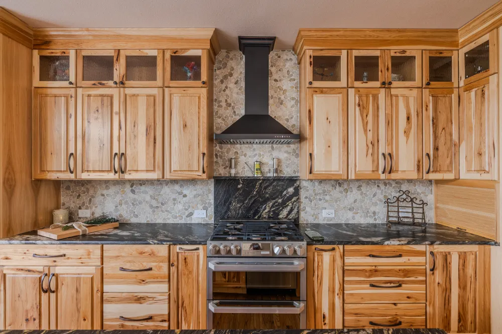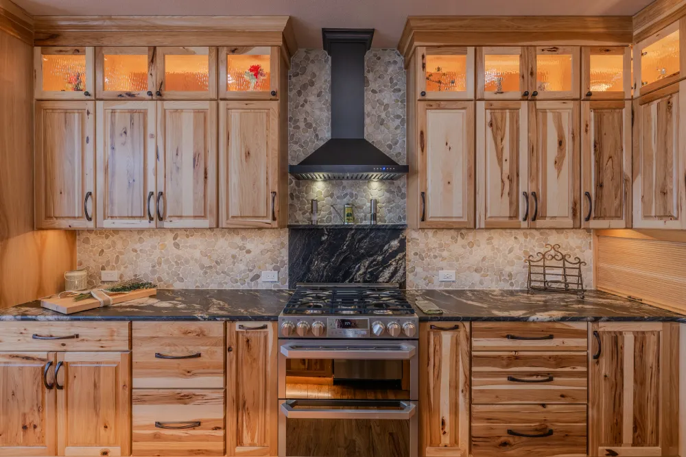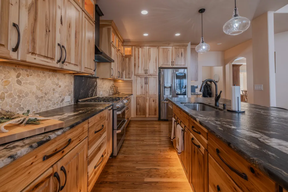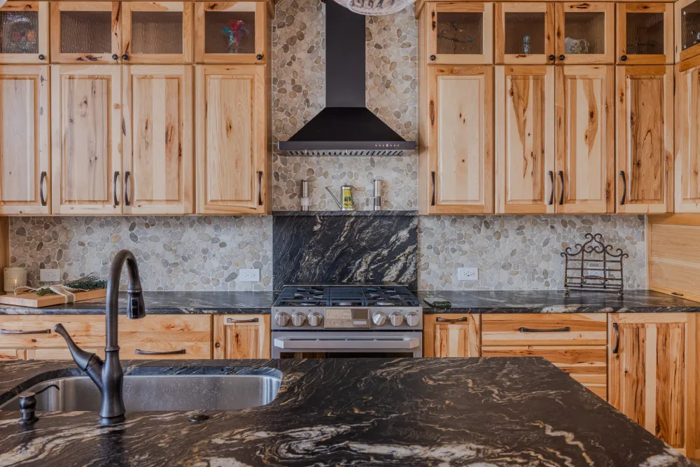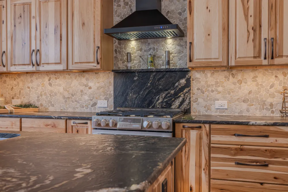 This kitchen showcases Omega Rustic Pecan Natural cabinetry in the Brookside door style, bringing warmth and character with its rich wood grain and natural knots. The Titanium leathered granite countertops provide a striking contrast, featuring deep, dramatic veining and a textured finish that enhances the rustic yet refined aesthetic. Complemented by a pebble stone backsplash and sleek stainless steel appliances, this space blends natural beauty with modern functionality. Perfect for those who appreciate timeless craftsmanship with a touch of rugged elegance!