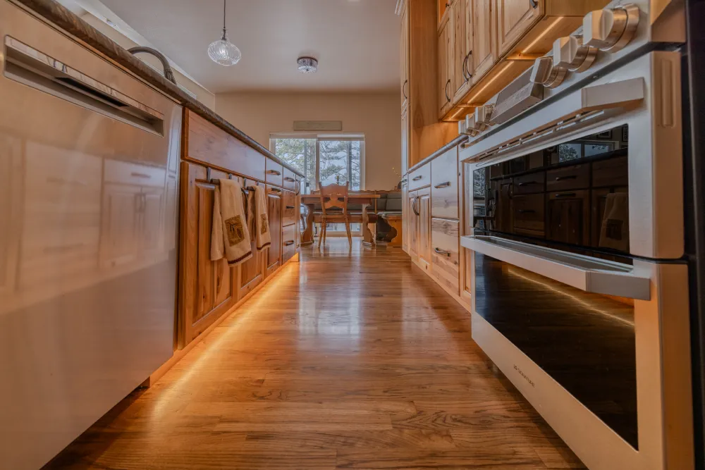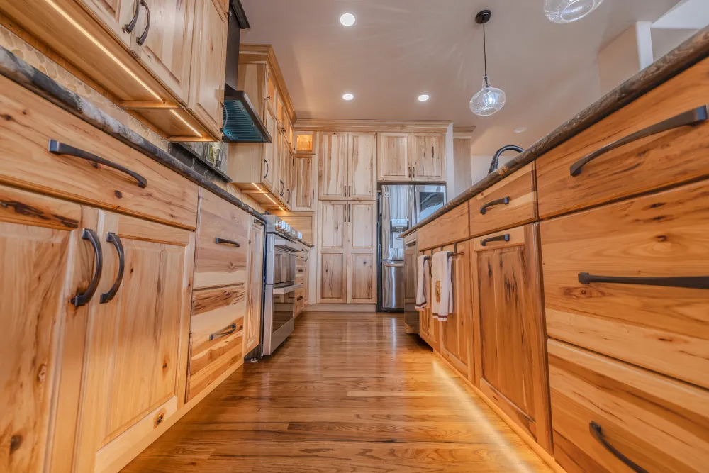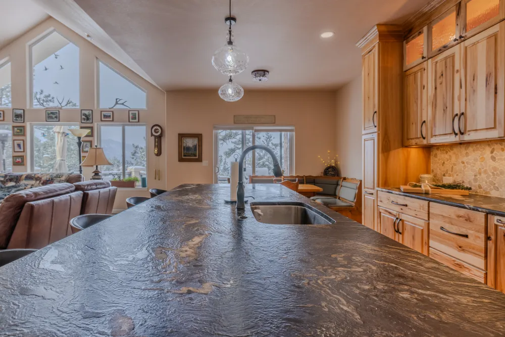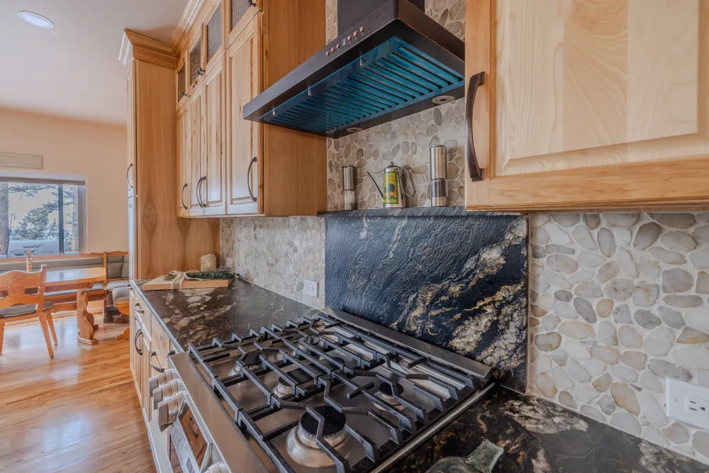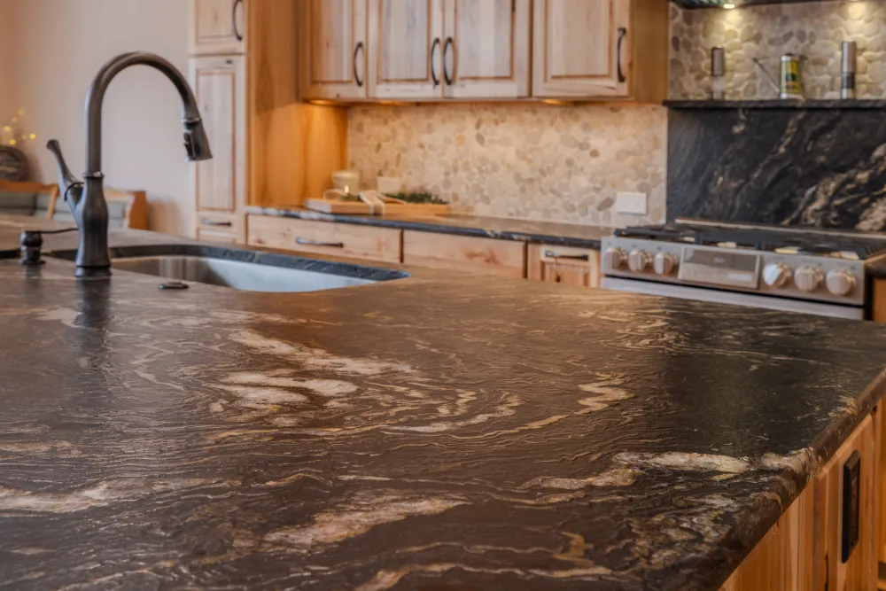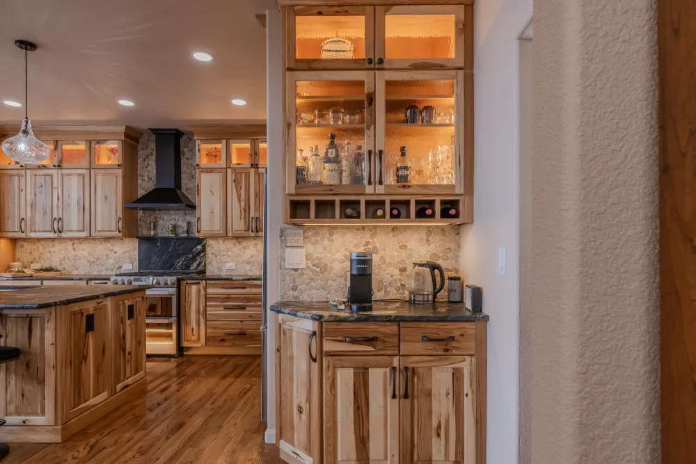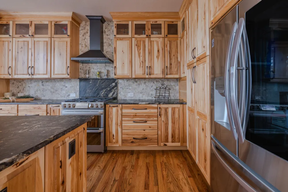 This kitchen showcases Omega Rustic Pecan Natural cabinetry in the Brookside door style, bringing warmth and character with its rich wood grain and natural knots. The Titanium leathered granite countertops provide a striking contrast, featuring deep, dramatic veining and a textured finish that enhances the rustic yet refined aesthetic. Complemented by a pebble stone backsplash and sleek stainless steel appliances, this space blends natural beauty with modern functionality. Perfect for those who appreciate timeless craftsmanship with a touch of rugged elegance!